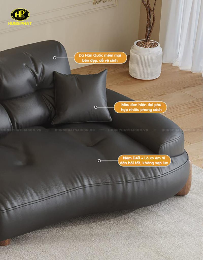 Sofa da văng dài màu đen H-407 mang phong cách hiện đại và tối giản, phù hợp với nhiều không gian nội thất. Với khung gỗ dầu chắc chắn, bọc da Hàn Quốc cao cấp và nệm mút D40 đàn hồi tốt, sản phẩm không chỉ bền đẹp mà còn mang lại trải nghiệm ngồi thoải mái.